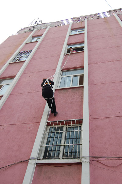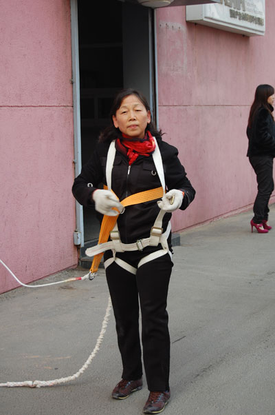 2010年11月19日下午,青島億和海麗高強力安全防護用品有限公司開展了高空火災防護自救互救演習。57歲的梁子蘭率先從高空使用救生緩降器安全下落到地面,并給大家現場講解使用方法,活動吸引了大批市民參與并現場觀摩。